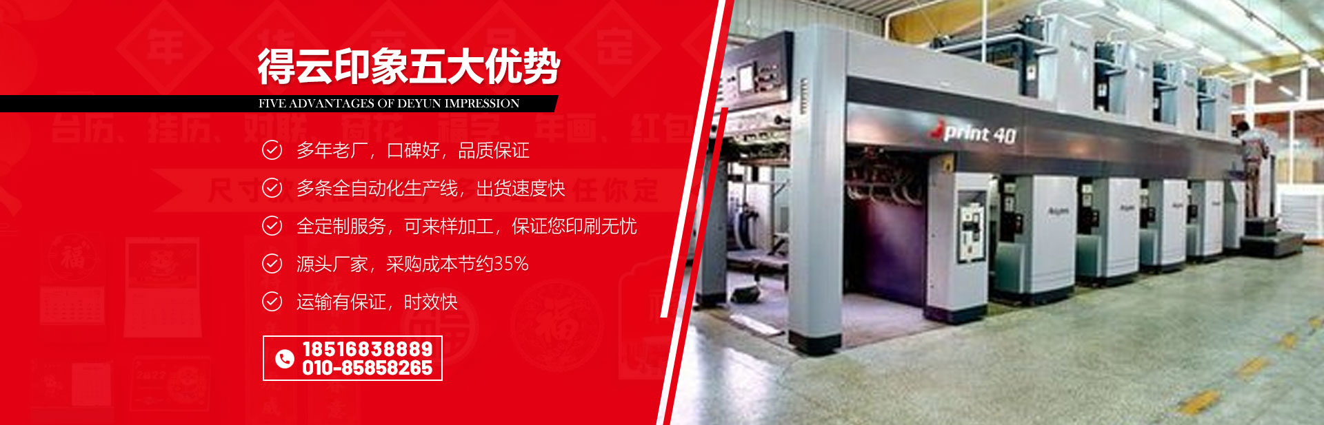 北京得云印刷集設計、印刷、后期加工為一體,經過多年來的艱苦奮斗,目前已擁有全新佳能6000,施樂彩色機,惠普高速打印機,EPSON寬幅彩色打樣機,德國海德堡GT052-4八開四色印刷機,德國曼羅蘭700對開四色印刷機,德國海德堡對開彩色6+1印刷機,德國羅蘭全開四色印刷機,日本利優比四開四色印刷機,曼羅蘭單色08膠印機,曼羅蘭單色47膠印機,臺灣大升商標等印刷機及數臺騎釘龍、膠訂龍,精裝龍,全自動覆膜機,全自動折頁機、全自動模切機、紙箱對裱機,精品盒開槽機,激光雕刻機,燙金機等印后加工設備,具備后期一條龍服務能力。公司專業印刷各類高中檔書刊,畫冊,期刊,彩色包裝盒,精品盒,紙箱藥盒,封套彩頁,臺歷掛歷,無碳復寫,手提袋,無紡布袋,PCV袋,塑料袋,廣告海報,信紙信封,檔案袋,不干膠商標,PVC商標等精美印刷。并承諾以快捷的速度和合理的價格服務新老客戶。